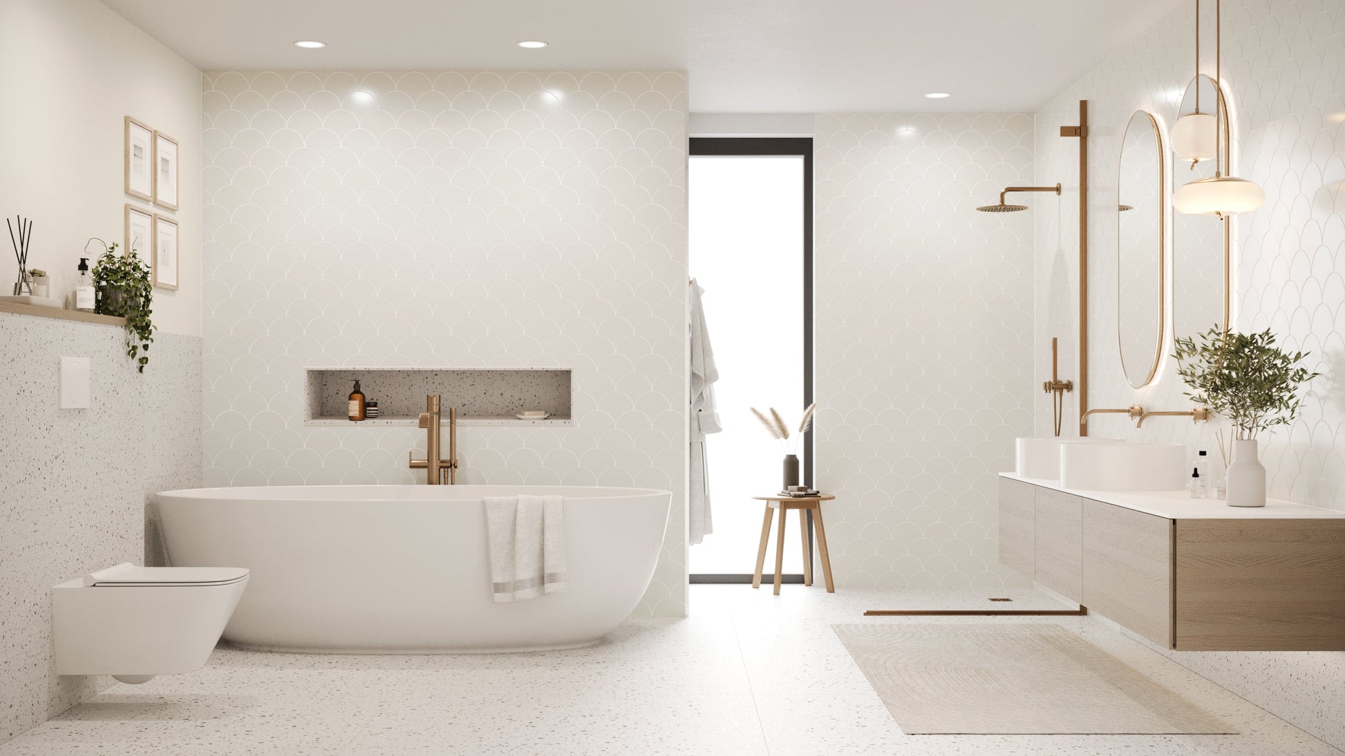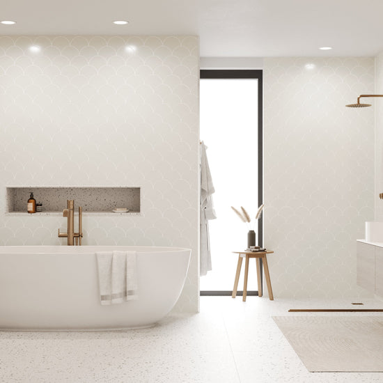 You can bring the suggestion of the sea to your bathroom with Reco Mermaid Tile Light Grey Wall Panels. This eye-catching tile alternative to traditional block tiling offers soft and calming lines. The circular pattern and soft waves with marine inspired colours will lend to a distinctive creative feel to any space.