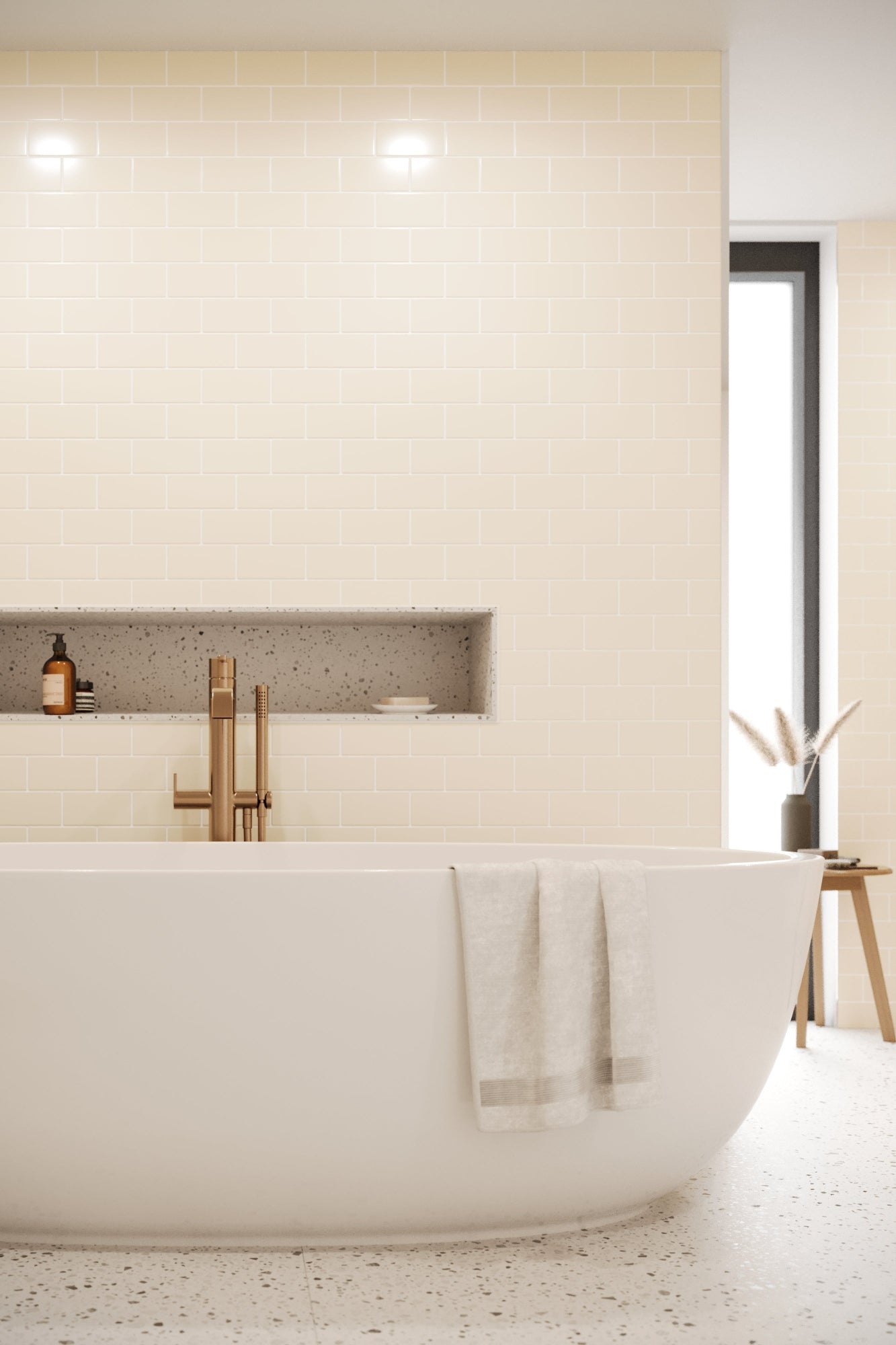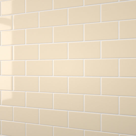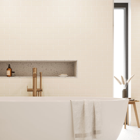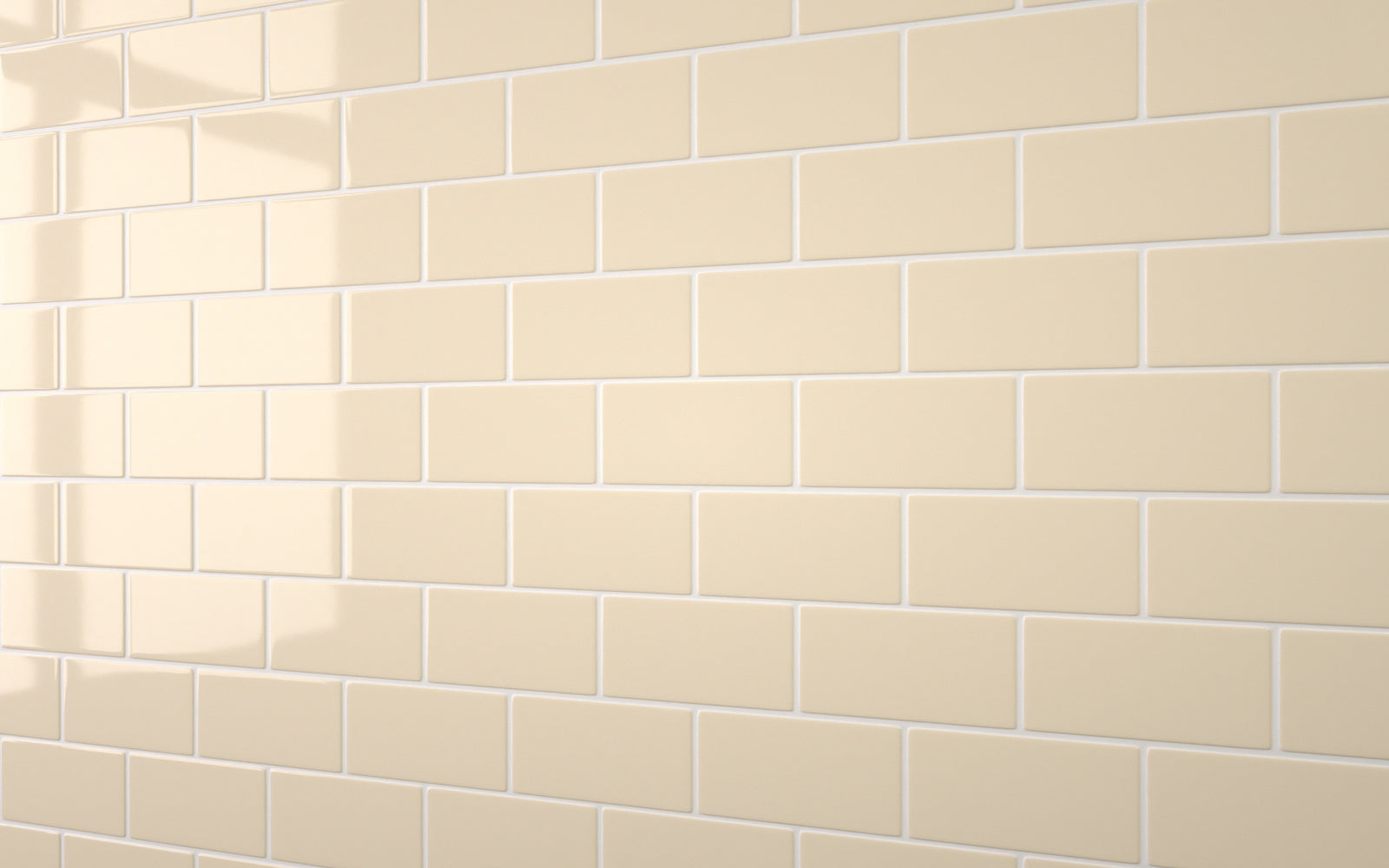 The Small Flat Metro Tile in Sand Wall Panel is inspired by the distinctive tiling of urban underground systems. ‘Metro’ tiles with their high-gloss brick look lend timeless geometric chic to any interior.